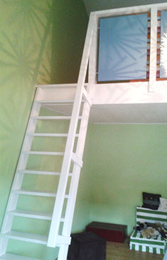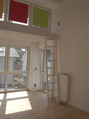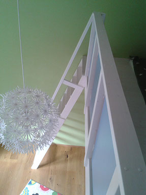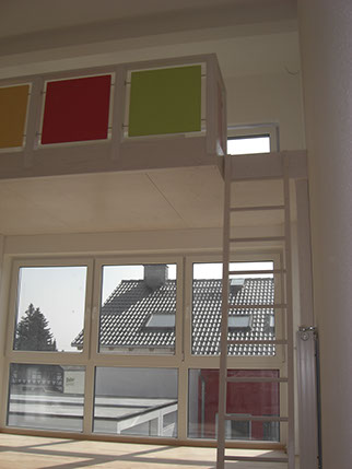 Schlafplatz mit Aussicht. Hochbett mit Spielfläche, Fichte lasiert/ Multiplex lackiert.