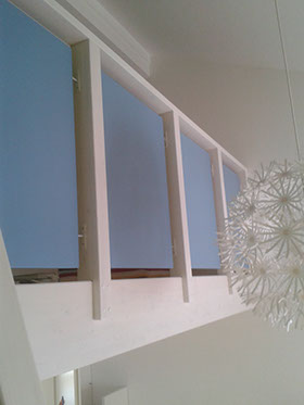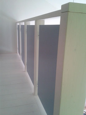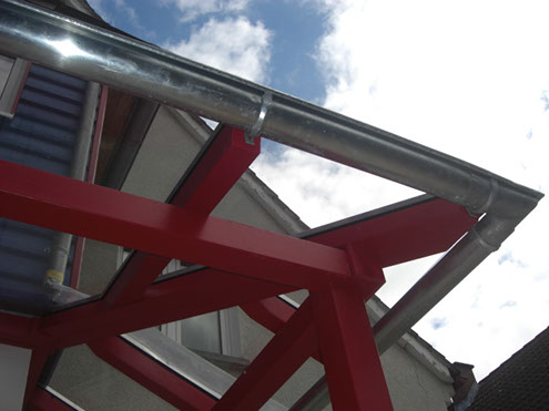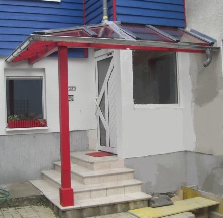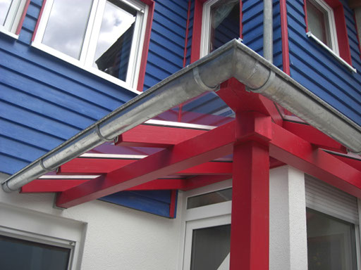 Farbenfroher Wetterschutz. Sicherheitsglas mit Aluminiumprofilen auf Holzkonstruktion.