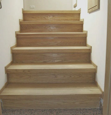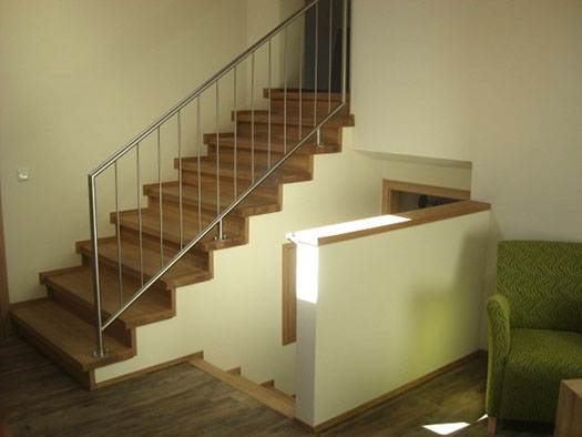 Edler Auftritt für die Gäste. Tritt- und Setzstufen, Eiche gebürstet und geölt. (Weingut Julianenhof, in Nierstein)