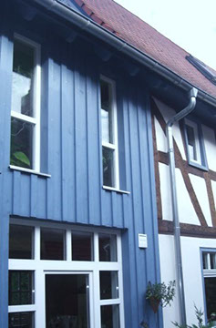 Verpackungskunst. Stülpschalung, Fichte lasiert. Fenster und Türen, Kiefer lackiert.