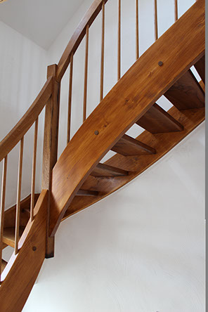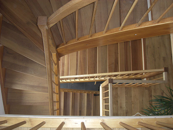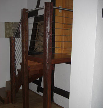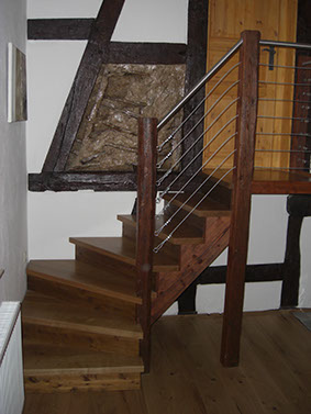 Alte Balken mit neuer Funktion. Aufgesattelte Treppe, Eiche geölt / Fichte lasiert.