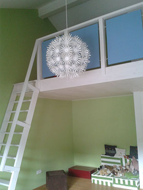 Räume eröffnen Möglichkeiten. Hochbett mit Spielfläche, Fichte lasiert / Multiplex lackiert.