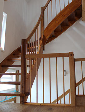 Alte Balken mit neuer Funktion. Aufgesattelte Treppe, Eiche geölt / Fichte lasiert.