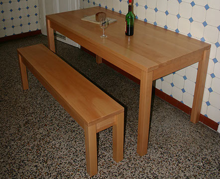 Kleine schmale Küche, aber alle wollen dort sein. Küchentisch mit Sitzbank. Buche geölt.